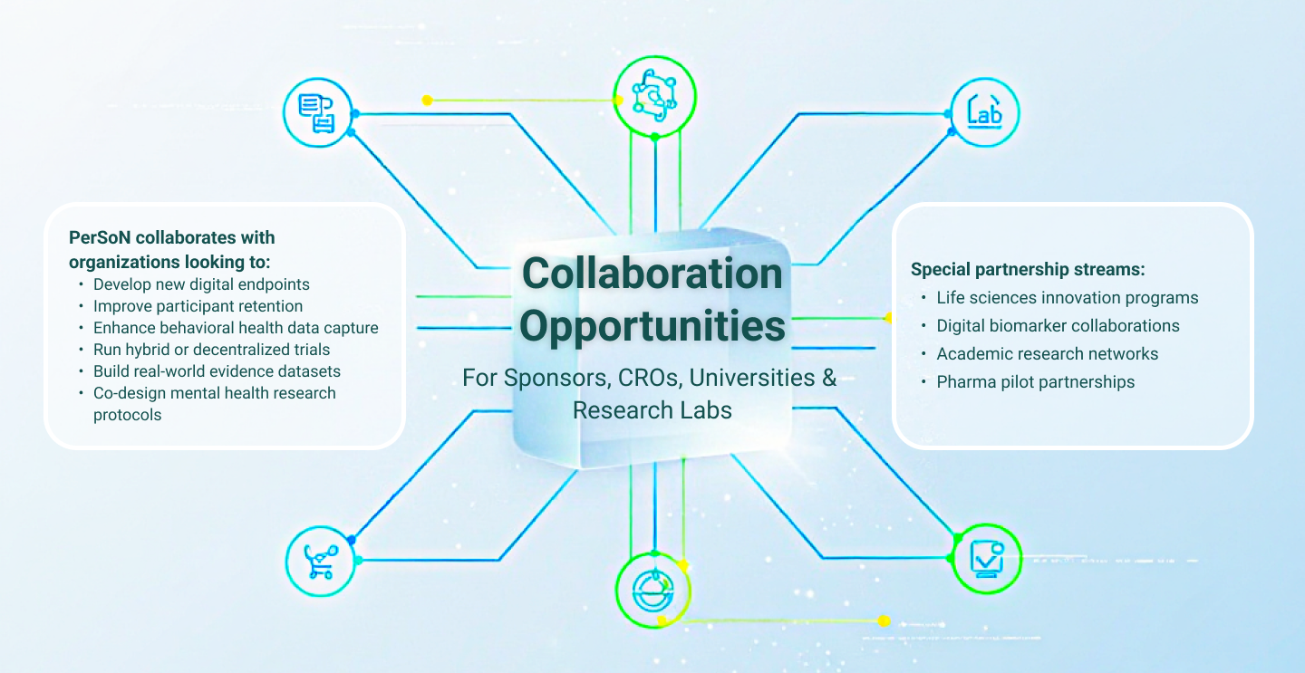 PerSoN fills this gap by providing continuous digital phenotyping, real-time engagement, and AI-powered insight across the entire study lifecycle.